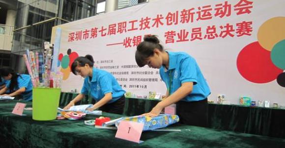 10月28日,深圳市第七屆職工技術創(chuàng)新運動會總決賽在COCOPARK購物廣場正式開鑼。本次競賽項目有收銀員手工點鈔、識別真假鈔、銀行卡收銀、統(tǒng)收條碼錄入以及營業(yè)員接待英語、商品包裝、商品推薦等。