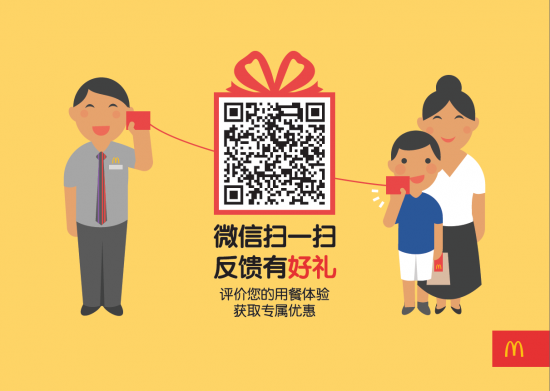 無(wú)論在麥當(dāng)勞餐廳用餐、得來(lái)速窗口購(gòu)餐還是通過(guò)麥樂(lè)送外送服務(wù)訂餐,顧客都可以通過(guò)移動(dòng)平臺(tái)進(jìn)行反饋:用餐小票背面及餐廳宣傳物將印有二維碼,微信掃描回復(fù)“m”即可進(jìn)入反饋?lái)?yè)面;通過(guò)微信、支付寶進(jìn)行手機(jī)支付的顧客,完成支付后還將收到推送信息,點(diǎn)擊即可開(kāi)始反饋;在麥當(dāng)勞微信公眾號(hào)回復(fù)“m”也可進(jìn)入平臺(tái)。顧客只需要約兩分鐘即可以完成反饋,并將立即收到麥當(dāng)勞經(jīng)典產(chǎn)品的優(yōu)惠券作為感謝回饋。