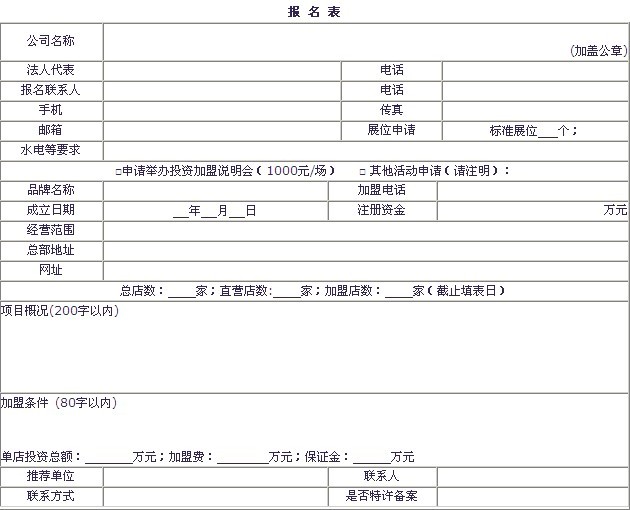 1.????? 認(rèn)真填妥《報名表》、《參展合約》加蓋公章后傳真或郵寄至組委會,并同時提供商標(biāo)注冊及營業(yè)執(zhí)照副本復(fù)印件及加盟宣傳手冊。